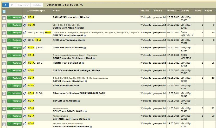 Möchte man nun noch einen schnellen Überblick haben, welche dieser Hündinnen z.B. eine HD-Auswertung hat, kann man die Liste über einen Klick im Spaltenkopf entsprechend sortieren lassen.